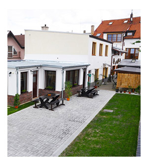 • posezení pod slunečníky ve dvoře penzionu