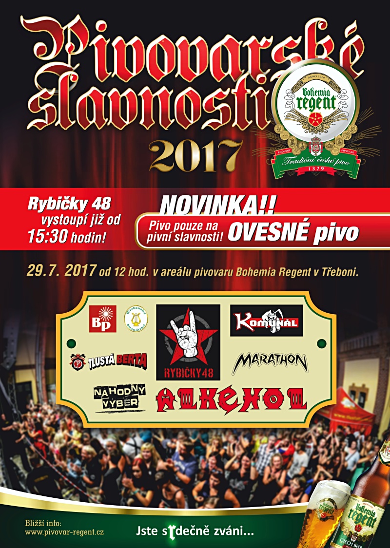 Vážení milovníci poctivého piva, v letošním roce se můžete těšit na již tradiční Pivní slavnosti pivovaru Regent, které proběhnou v sobotu 29. července 2017 a potrvají do ranních hodin následujícího dne.
